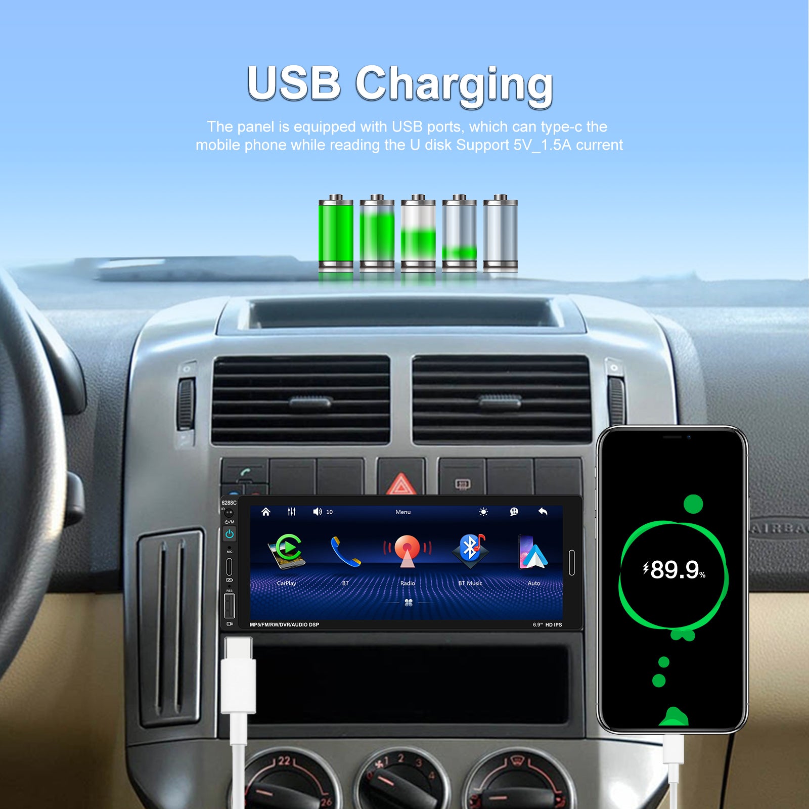 Mirror your phone display (Android/iPhone) directly to the stereo using your phone’s original USB cable — view apps, videos, and media effortlessly.